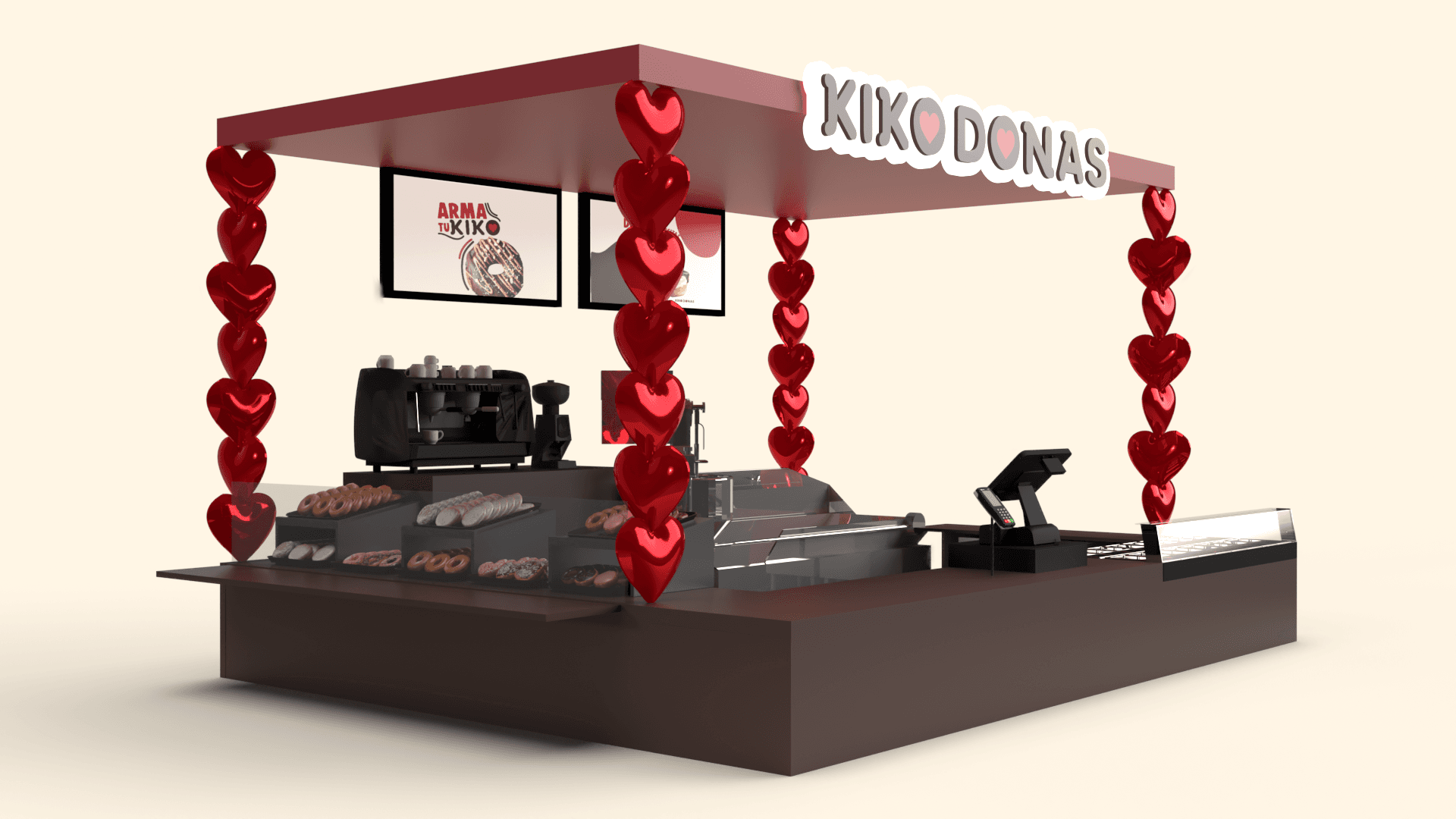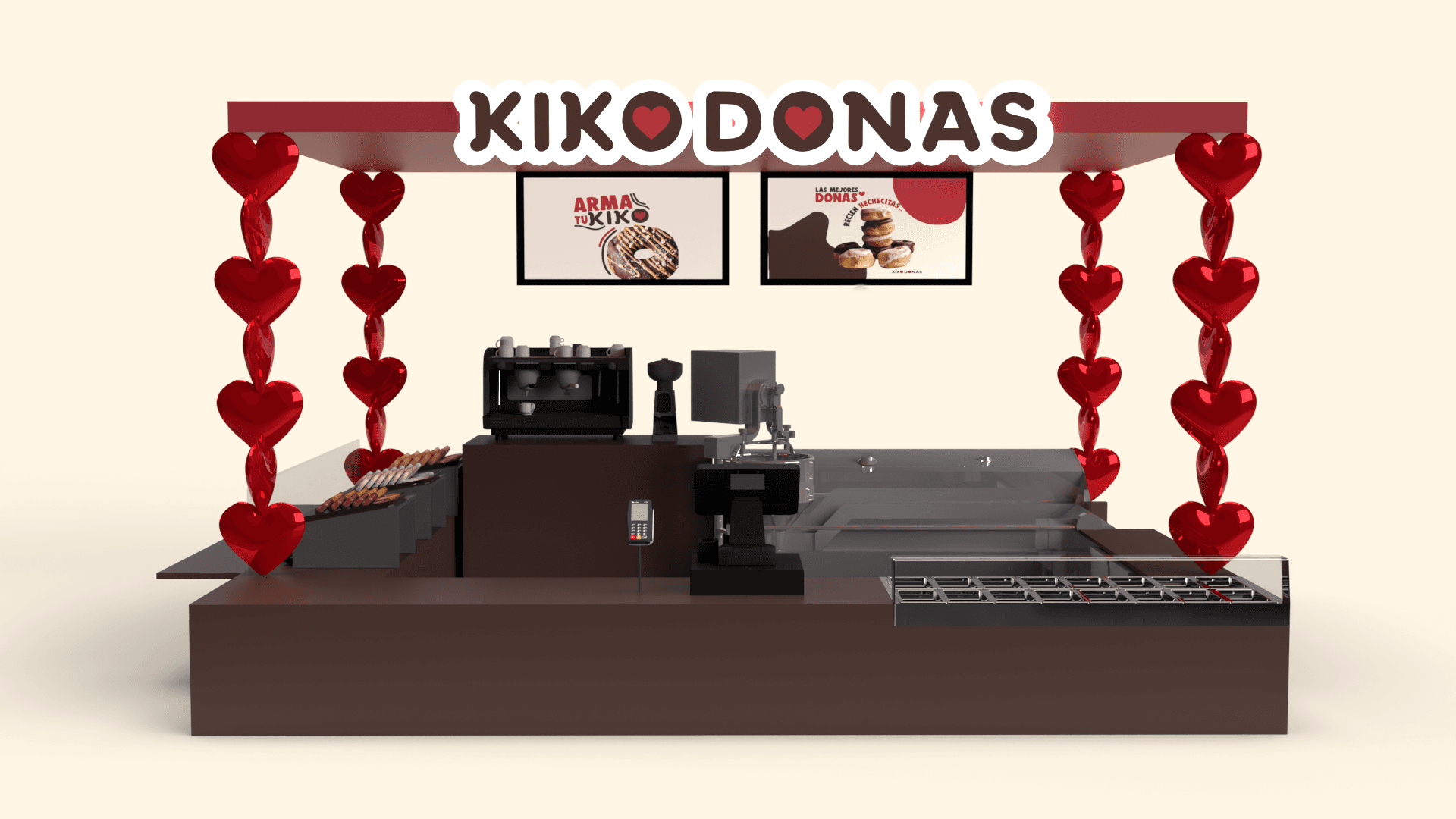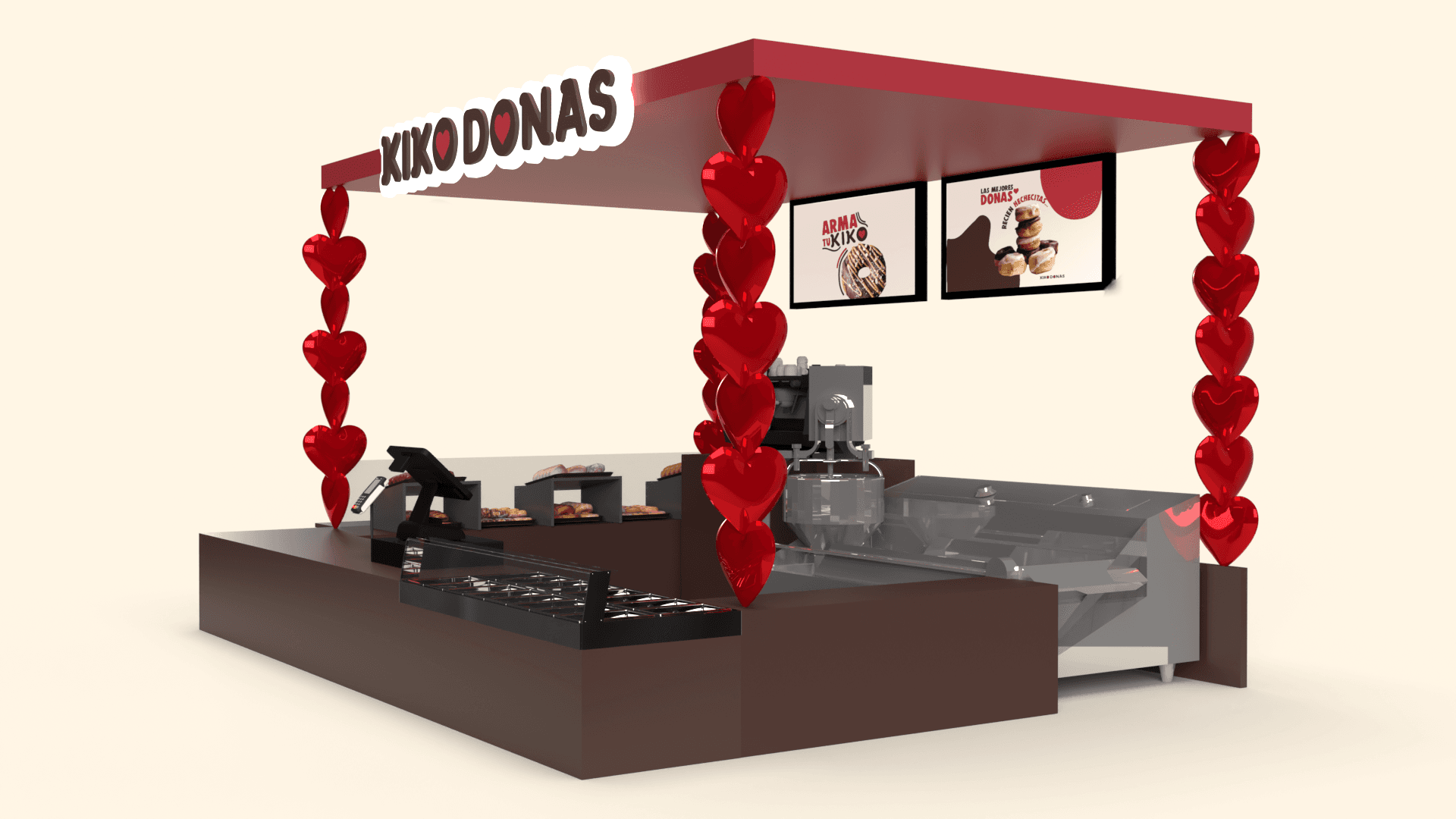 Cuando las donas están recién hechas, las repisas de corazones se iluminarán para que el cliente reconozca que están listos para comprarlas y comerlas bien calientitas.